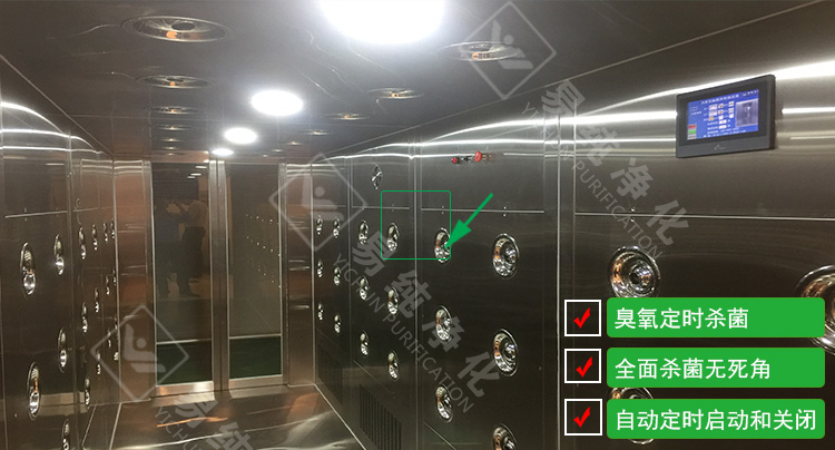 2、內(nèi)置微型臭氧滅菌:由于紫外線殺菌有一定的局限性及死角,其風(fēng)淋靜壓廂內(nèi)部的殺菌效果較差,我們在風(fēng)淋內(nèi)部嵌入了微型臭氧發(fā)生器,同樣采用在控制系統(tǒng)里面安裝定時計時裝置,自動啟動殺菌系統(tǒng)。